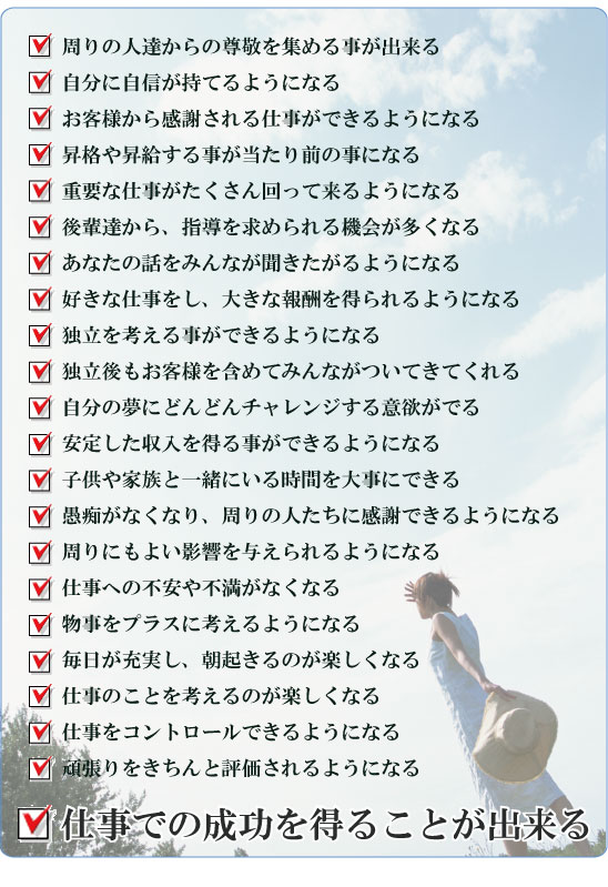 しかし、今の自分から抜け出したい。変わりたいと願うのであれば、今回のこの出会いをうまく利用して、 あなたの仕事をもっともっと楽しいものにしていきませんか。